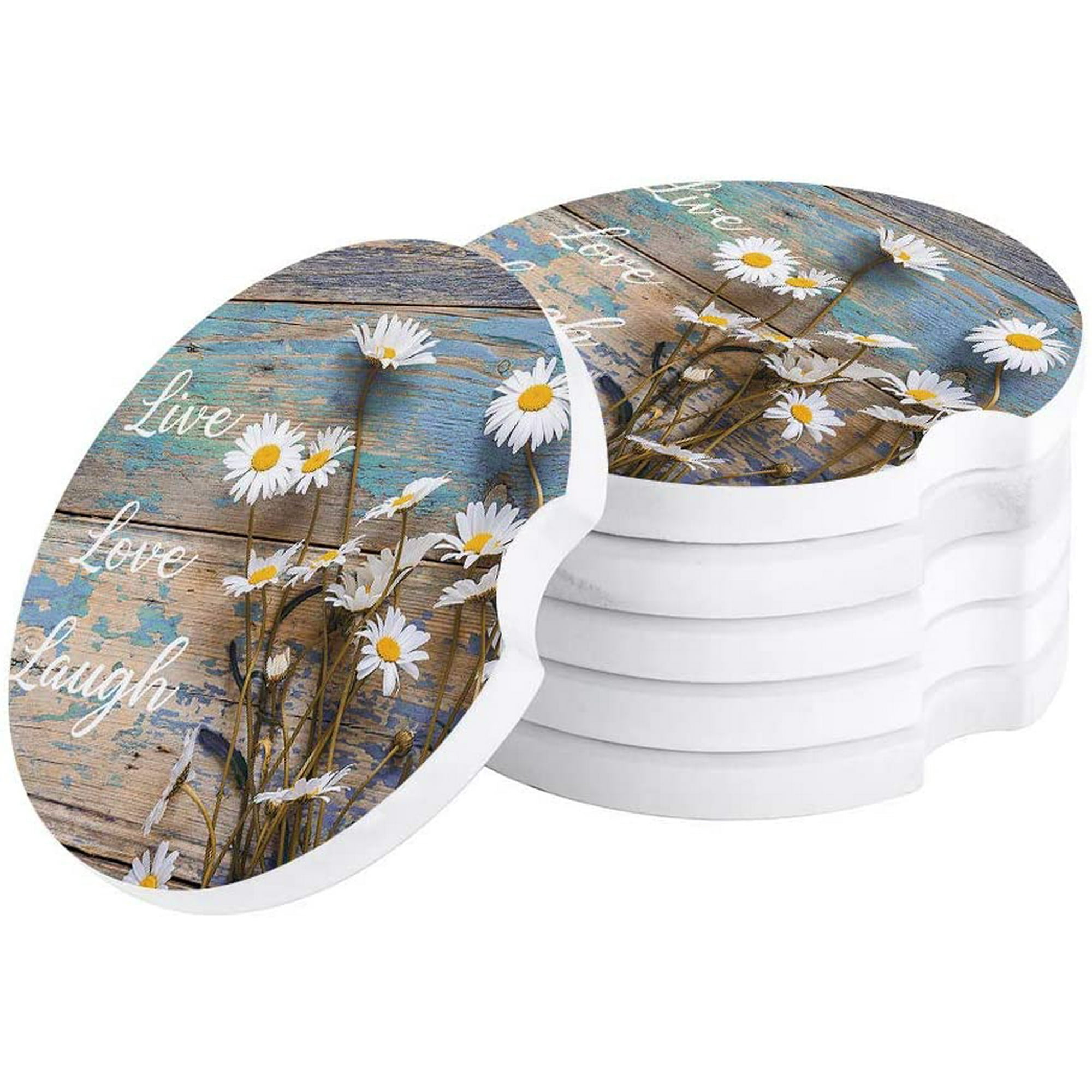 Poglip White Daisy Flowers On Rustic Wooden Barn Set Of 2 Car Coaster For Drinks Absorbent Ceramic Stone Coasters Cup Mat With Cork Base For Home Kitchen Room Coffee Table Bar Decor